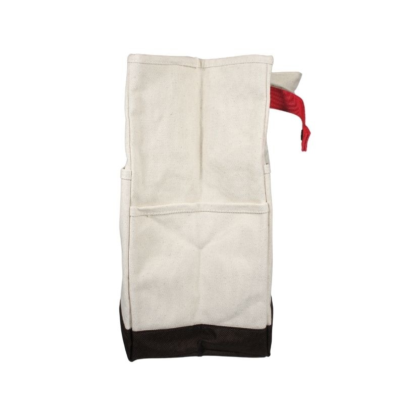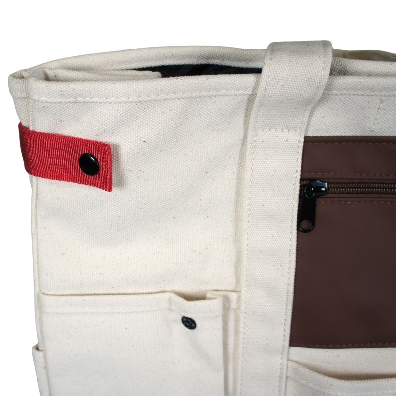 荷物が少ない時は両端のレッドテープでマチを留めてスリムにスッキリと広げた時は前面のスナップに付けてポケット口をホールド